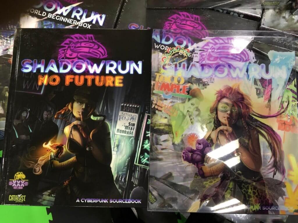 I had already seen a physical copy of the Shadowrun, Sixth World Beginner Box, but this show gave me my first chance to hold the Neo-Anarchist Streetpedia, No Future, and our dice and Edge tokens set. Our art and design people rocked it—they are all beautiful! But in particular I want to share the cover of No Future, with its AR slipcover and gritty reality main cover. Echo Chernik is one of our favorite artists for a reason, and she made a gorgeous, striking image.