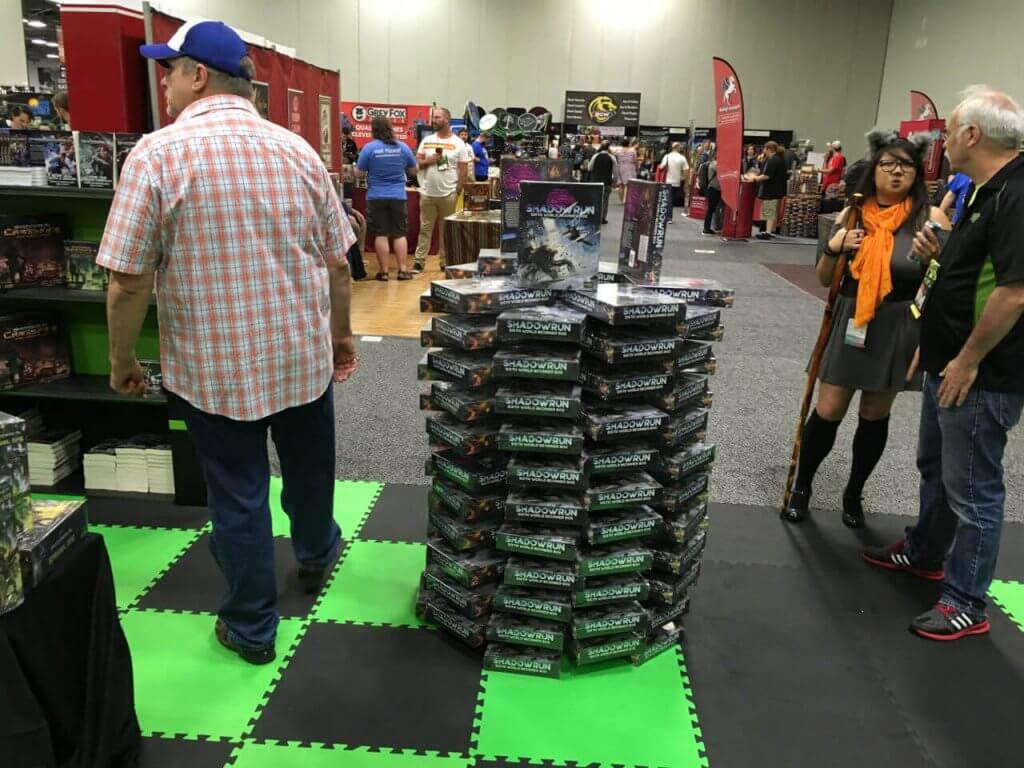 The star of the show, of course, was the Beginner Box. The response was tremendous, and we sold more of them than any Shadowrun RPG item at Origins in the past ten years (and possibly longer, but ten years is as far as my personal memory goes). Having lots of boxes to sell means I get to experiment with different stacking styles—this was my beginning-of-day-four stack. It was much smaller at day’s end!