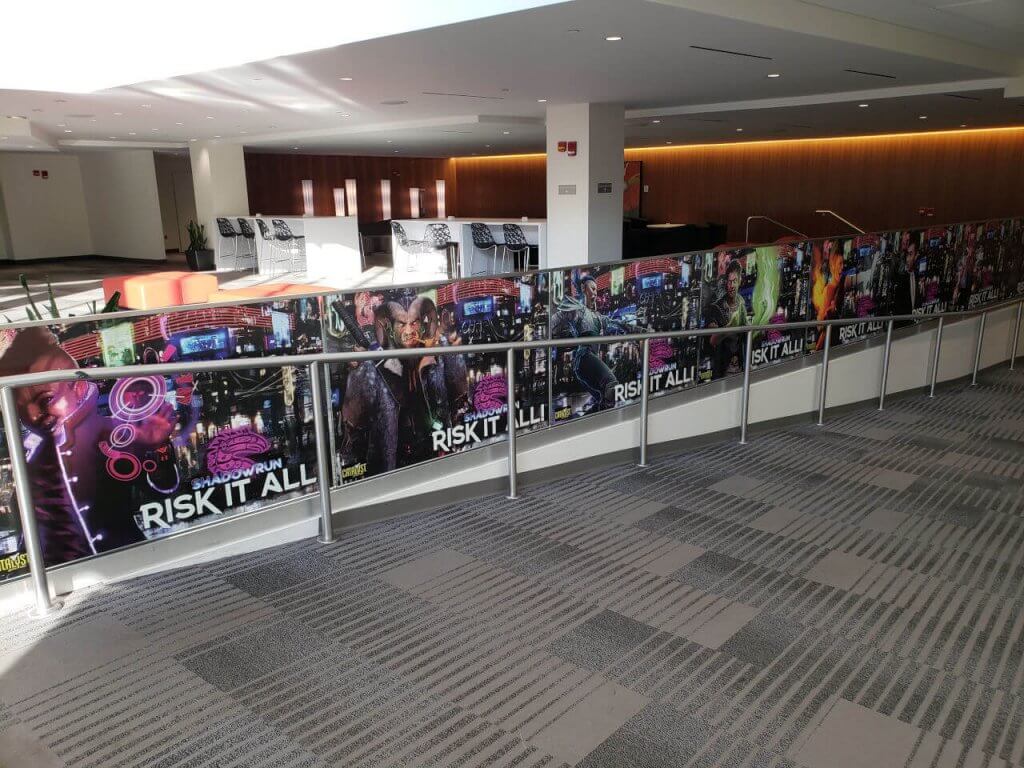 A staircase leading to the convention hall featured a rogues’ gallery of Sixth World characters, set on a stunning city backdrop.